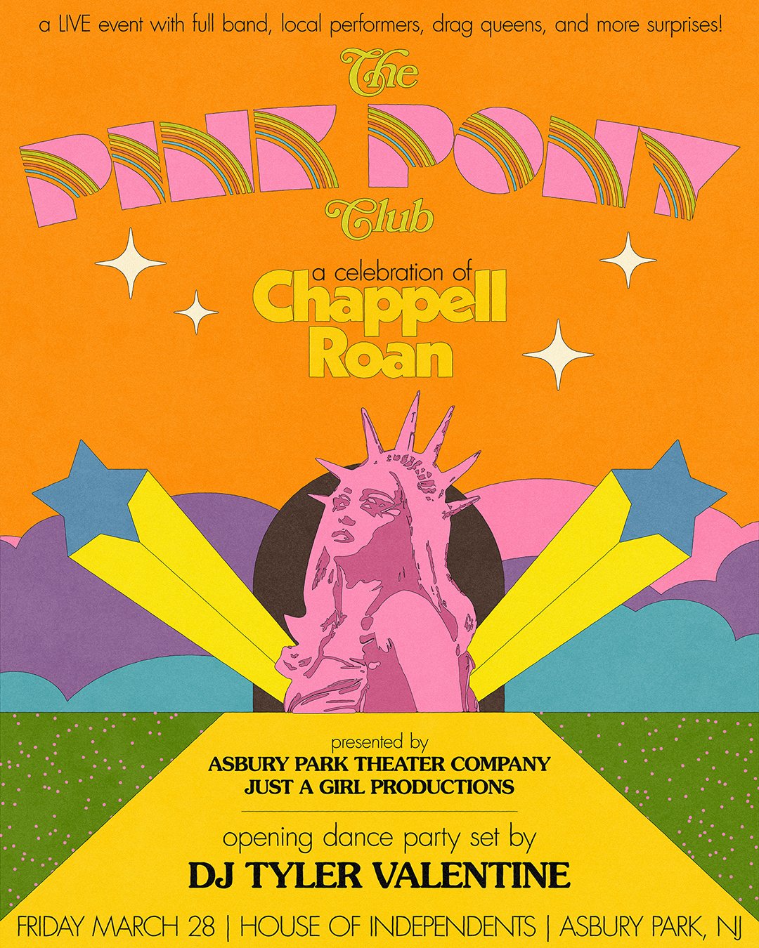 Since Anthony is a fan of 1970s aesthetics, my wheelhouse, I was tasked to bring the look and feel of classic 70s Broadway and television variety shows and create a new logo, associated collateral and merch, as well as a round of posters and flyers.